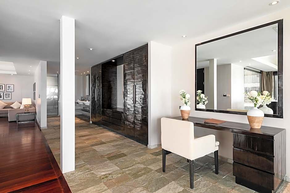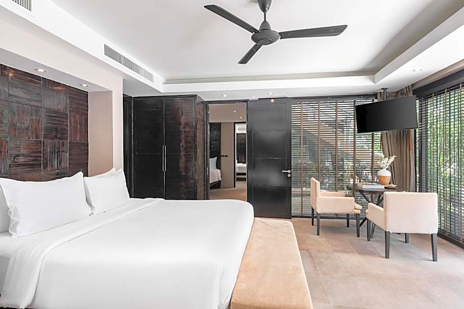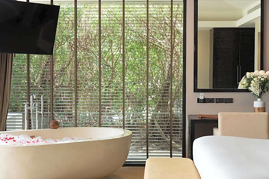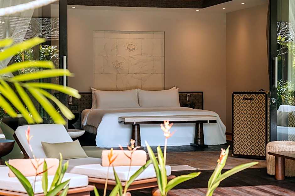 Located on the private beach side of the resort, this air-conditioned room offers ultimate privacy and chic luxury. All are equipped with a walk-in rain shower and a dining table. It features floor to ceiling glass walls and a spacious private lounging patio with a fan.
